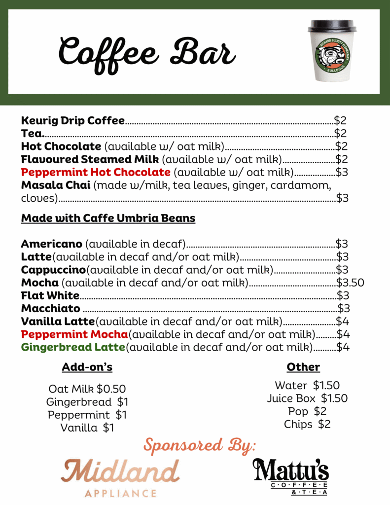 - Thank you to Midland Appliance for the use of their Jura X8 Espresso Machine and Caffe Umbria coffee bean donations, and Mattu’s Coffee & Tea for the Torani syrup donations.